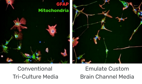 The Brain-Chip R1 maintains glial populations in a physiologically resting state. Baseline cytokine profiling reflects quiescent microglia and astrocytes similar to those found in the healthy CNS. When stimulated with IL-1β, the system mounts a robust, coordinated inflammatory response, demonstrating that the glial populations remain responsive to perturbation and capable of recapitulating neuroinflammatory signaling pathways. Imaging further confirms that optimized channel-specific media preserve resting glial morphologies, whereas alternative media formulations induce signs of activation.