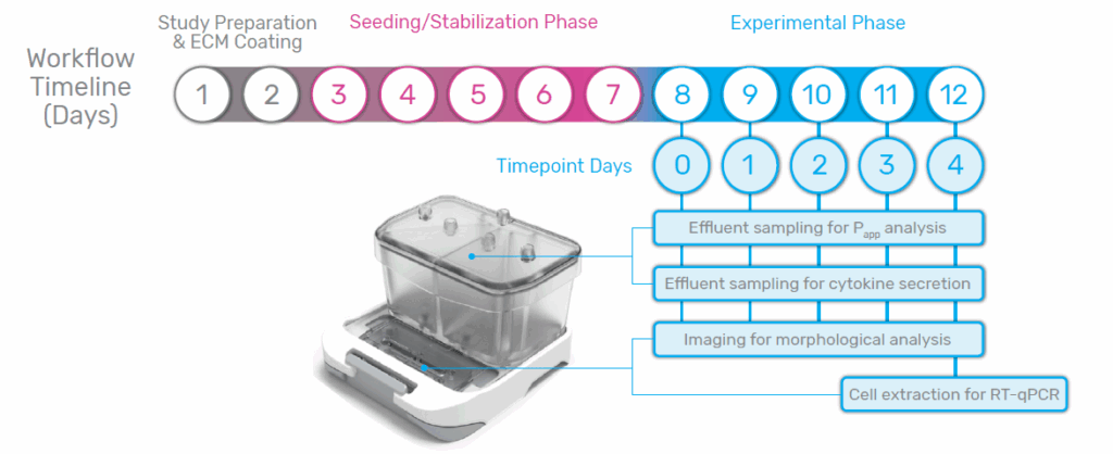 A Brain-Chip R1 experiment can be completed within a 12-day timeline. Organ-Chip consumables are first prepped for seeding, and then cells are seeded directly onto the chips, connected to flow, and allowed to stabilize before the start of the experimental window. During the experimental phase (Timepoint Days 0-4), daily imaging can be performed to monitor morphology, and effluent can be sampled to analyze barrier integrity and cytokine secretion. At the end of the experimental window, cells can be extracted from the chip for further downstream analysis such as RT-qPCR.