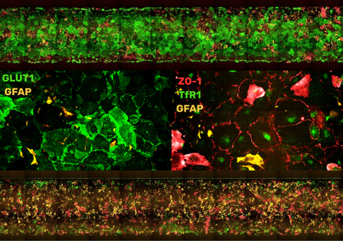 Immunofluorescence imaging of the brain channel reveals that neurons, astrocytes, microglia, and pericytes organize into integrated multicellular clusters with physiologically relevant morphologies. Neurons extend elongated processes, astrocytes display stellate morphologies with branching projections, microglia adopt small ramified forms consistent with a resting state, and pericytes associate closely with neuronal and astrocytic structures. These interactions result in a structurally coherent top channel that visually recapitulates key features of human NVU cytoarchitecture.